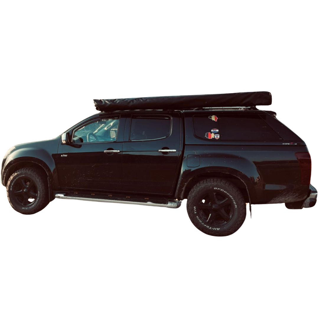 The awning is designed for mounting on the left side of the vehicle. The cover that goes around the awning is made of black material, the awning itself has a khaki color on the inside and outside so as not to absorb too much heat.